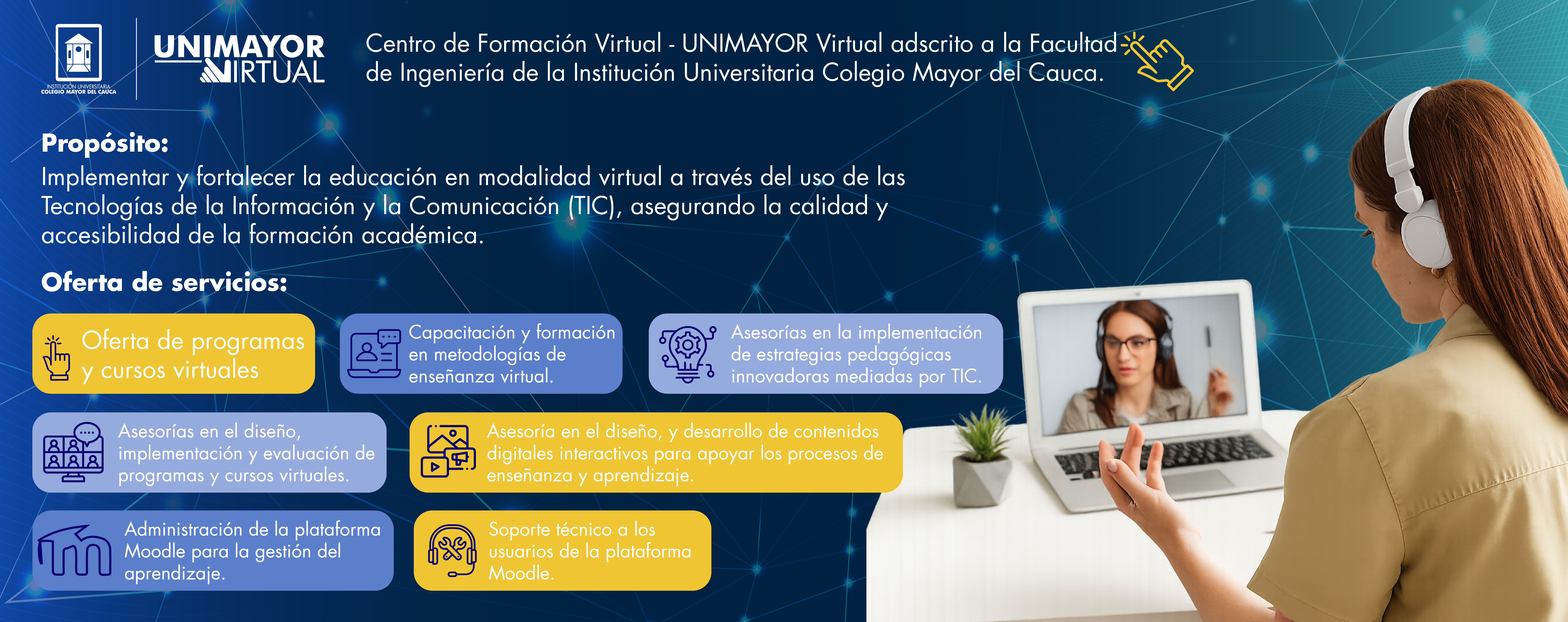 Gestiona e integra la educación virtual. Es clave para articular las demás dimensiones del proceso formativo.